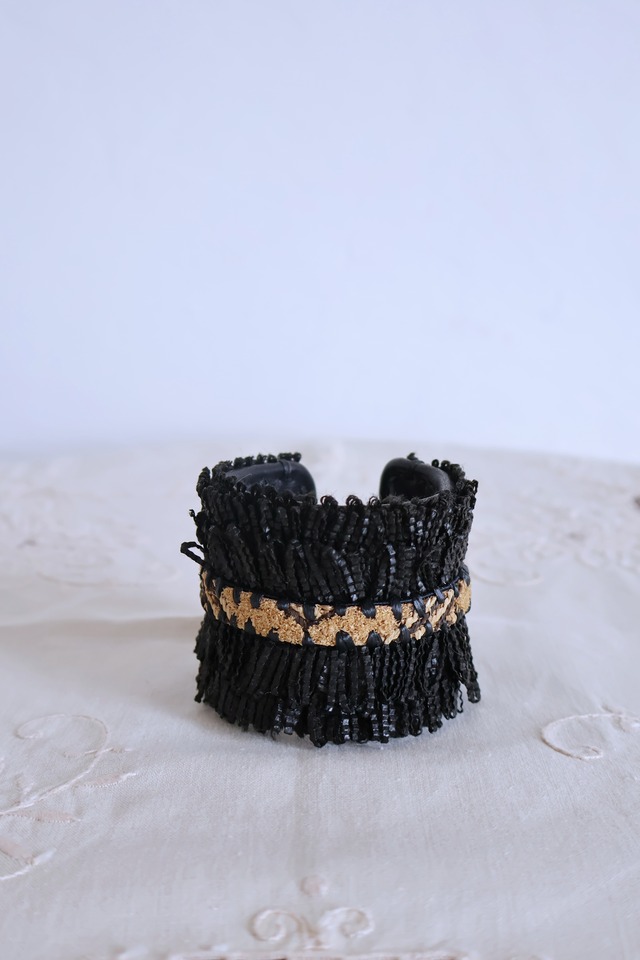 使用されているクバ布はコンゴのクバ族によって手仕事で生まれたアンティークの織物。 もともとは王族や儀式用としてしようされていたととも価値ある1点ものです。 そのクバを使用して作られた個性的で唯一無二のバングル。 ワイヤー入りでサイズは変更できますので、セーターなどの上に着用もしていただけます。 サイズ 長さ17cm 幅3.5cm 素材 クバ布 / レザー