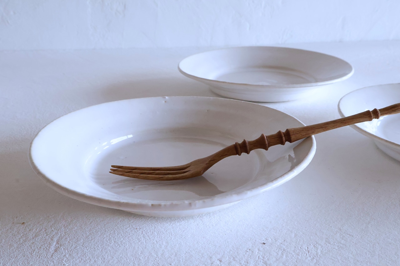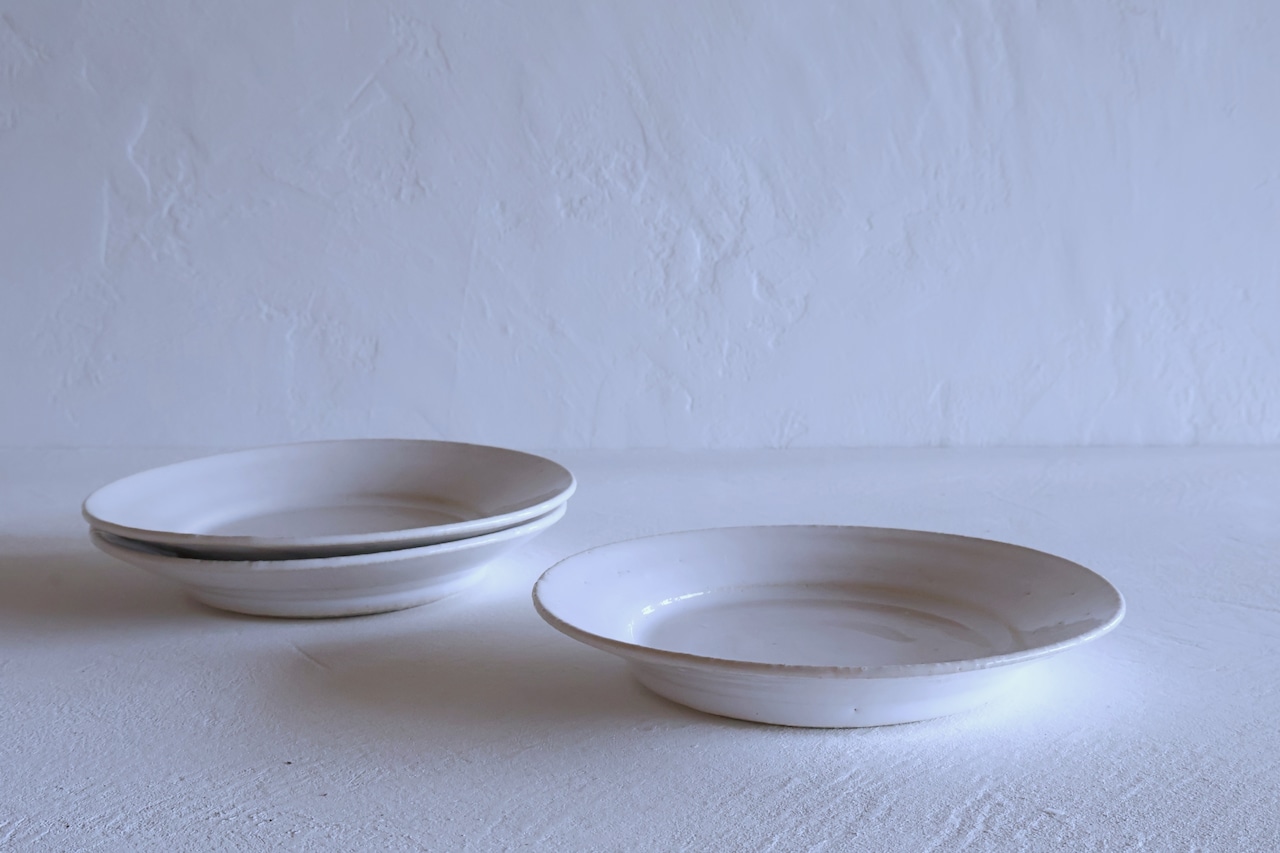 少し粗めな土の陶器に使われている釉薬は、ぽってりやわらかでありながらな精錬な白と焼き締めの少し黄味がかった楽しいテクスチャーのものがあります。
