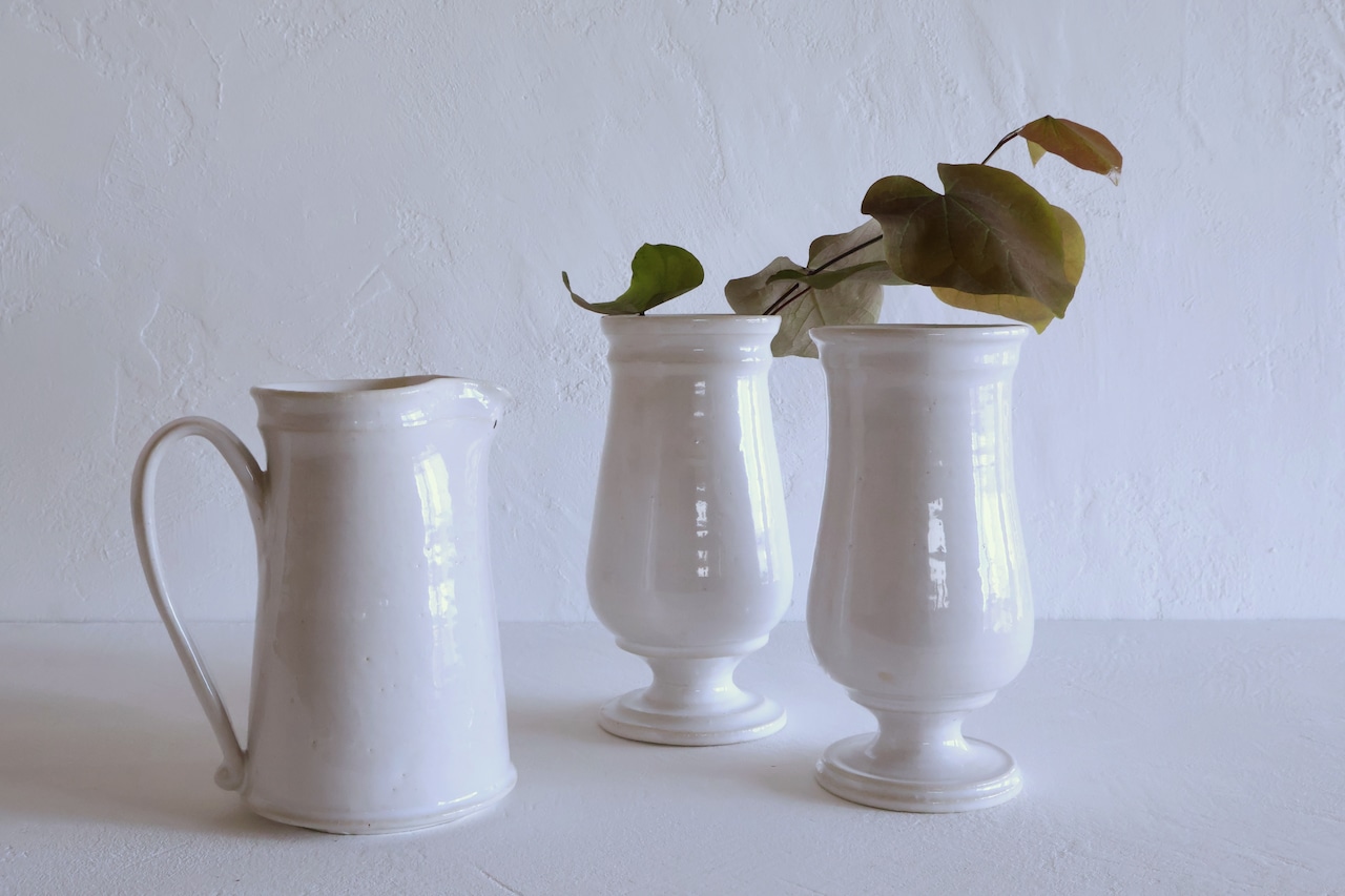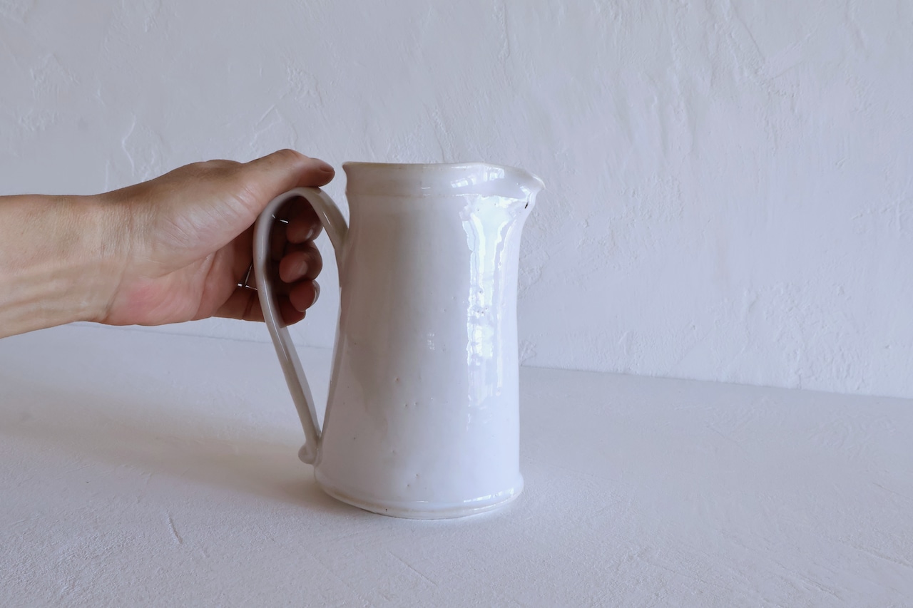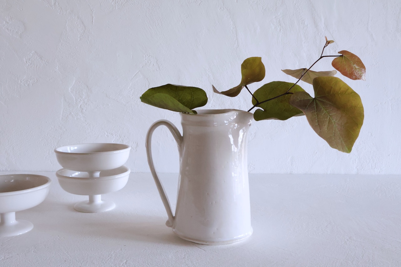 少し粗めな土の陶器に使われている釉薬は、ぽってりやわらかでありながらな精錬な白と焼き締めの少し黄味がかった楽しいテクスチャーのものがあります。