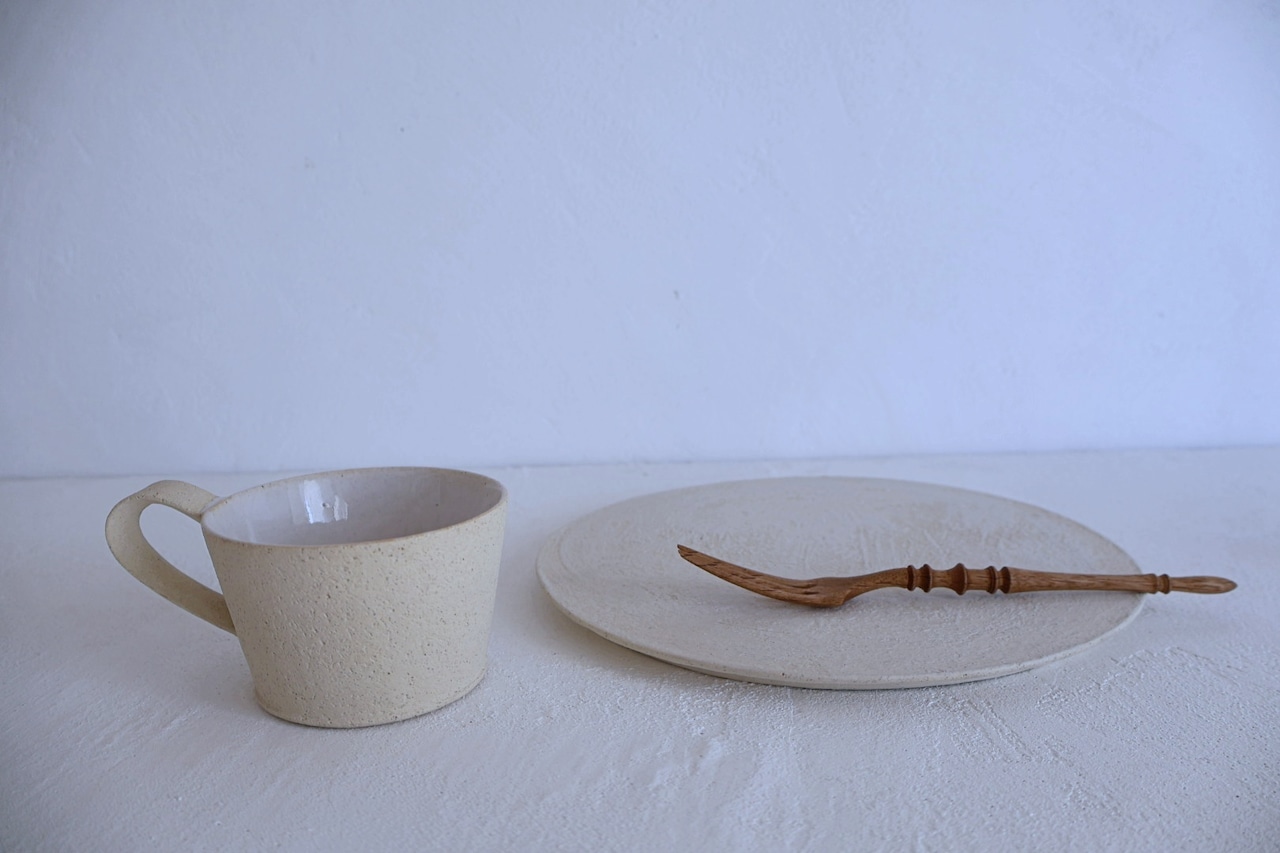 少し粗めな土の陶器に使われている釉薬は、ぽってりやわらかでありながらな精錬な白と焼き締めの少し黄味がかった楽しいテクスチャーのものがあります。