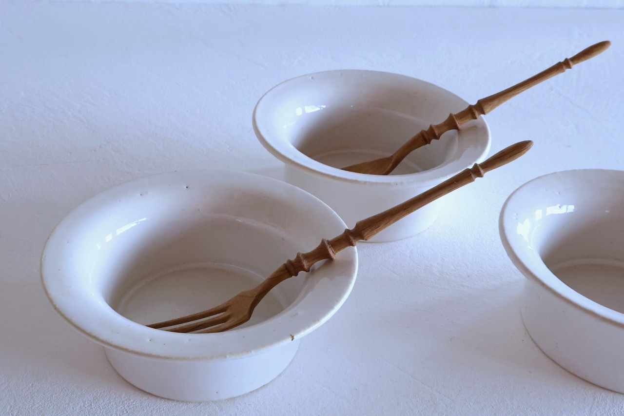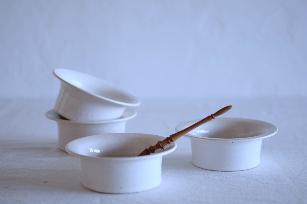 少し粗めな土の陶器に使われている釉薬は、ぽってりやわらかでありながらな精錬な白と焼き締めの少し黄味がかった楽しいテクスチャーのものがあります。