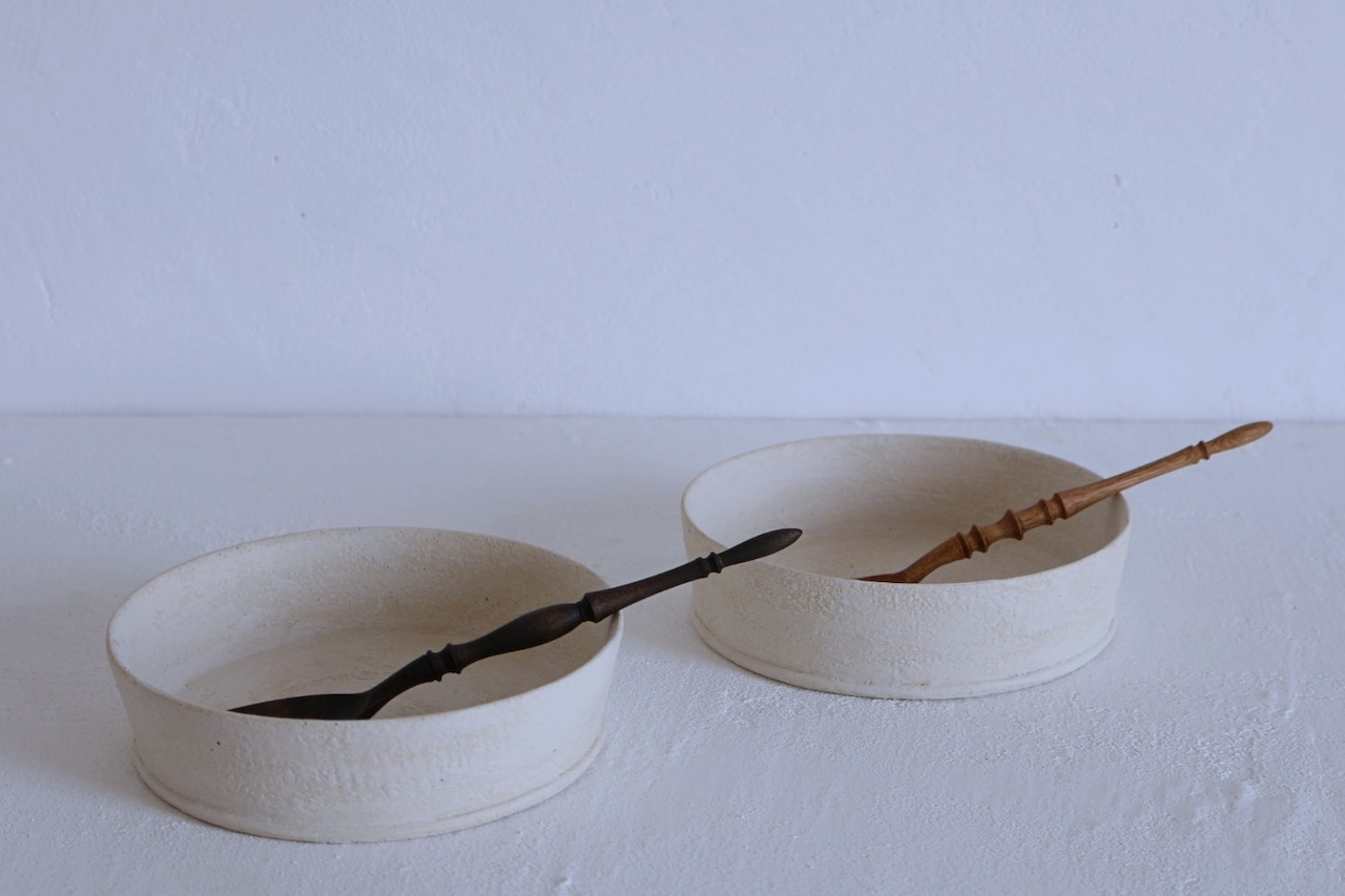 少し粗めな土の陶器に使われている釉薬は、ぽってりやわらかでありながらな精錬な白と焼き締めの少し黄味がかった楽しいテクスチャーのものがあります。